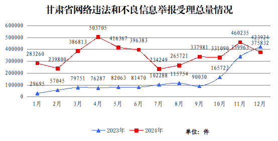2024年度,甘肅省委網信辦緊扣全省工作大局,發揮職能作用,全面排查清理網絡違法和不良信息,著力推動網絡綜合治理體系建設取得新成效,共受理各類舉報信息423.1萬件,同比增長157.4%。