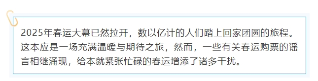 這些謠言形式多樣、手段各異:或是憑空虛構搶票時間,故意編造提前或延遲的搶票時間,誤導旅客在錯誤時間搶票,錯過正常購票時機;或是謊稱加價可代搶票,要求旅客支付高額手續費或提供個人信息,嚴重侵犯旅客的財產安全和個人隱私;或是夸大搶票成功率,吸引眾多旅客付費使用,但所謂的高成功率根本無法兌現;或是編造虛假票務政策,傳播不實票務規則,如退票政策、改簽政策變化等……在這些謠言的蠱惑下,眾多旅客信以為真,紛紛調整計劃,滿心期待著能搶到票,結果卻是“竹籃打水一場空”。