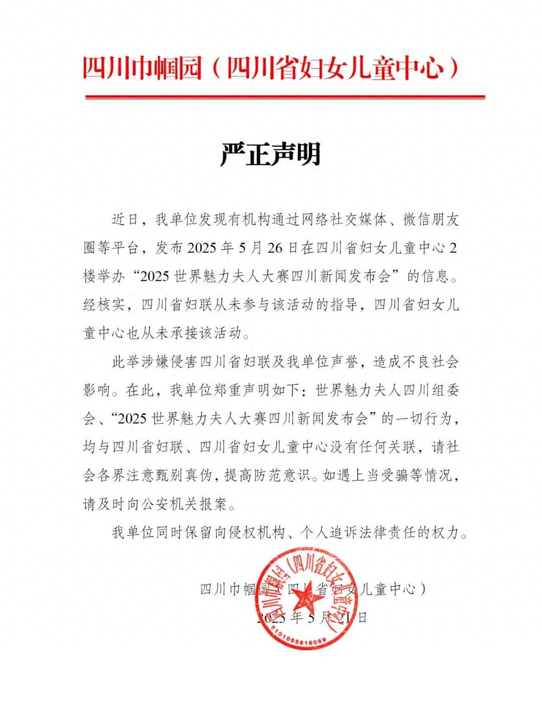 此舉涉嫌侵害四川省婦聯及我單位聲譽,造成不良社會影響。在此,我單位鄭重聲明如下:世界魅力夫人四川組委會、“2025世界魅力夫人大賽四川新聞發布會”的一切行為,均與四川省婦聯、四川省婦女兒童中心沒有任何關聯,請社會各界注意甄別真偽,提高防范意識。如遇上當受騙等情況請及時向公安機關報案。