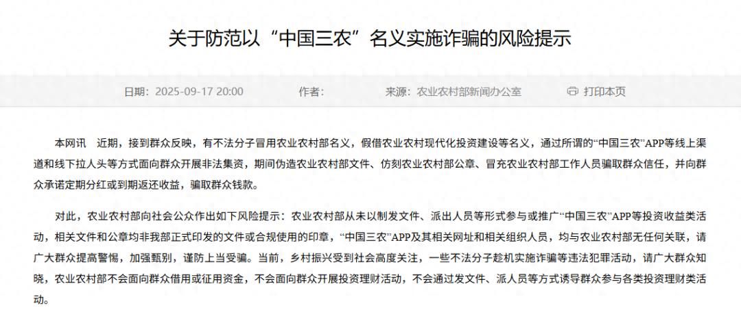對此,農業農村部向社會公眾作出如下風險提示:農業農村部從未以制發文件、派出人員等形式參與或推廣“中國三農”APP等投資收益類活動,相關文件和公章均非我部正式印發的文件或合規使用的印章,“中國三農”APP及其相關網址和相關組織人員,均與農業農村部無任何關聯,請廣大群眾提高警惕,加強甄別,謹防上當受騙。當前,鄉村振興受到社會高度關注,一些不法分子趁機實施詐騙等違法犯罪活動,請廣大群眾知曉,農業農村部不會面向群眾借用或征用資金,不會面向群眾開展投資理財活動,不會通過發文件、派人員等方式誘導群眾參與各類投資理財類活動。